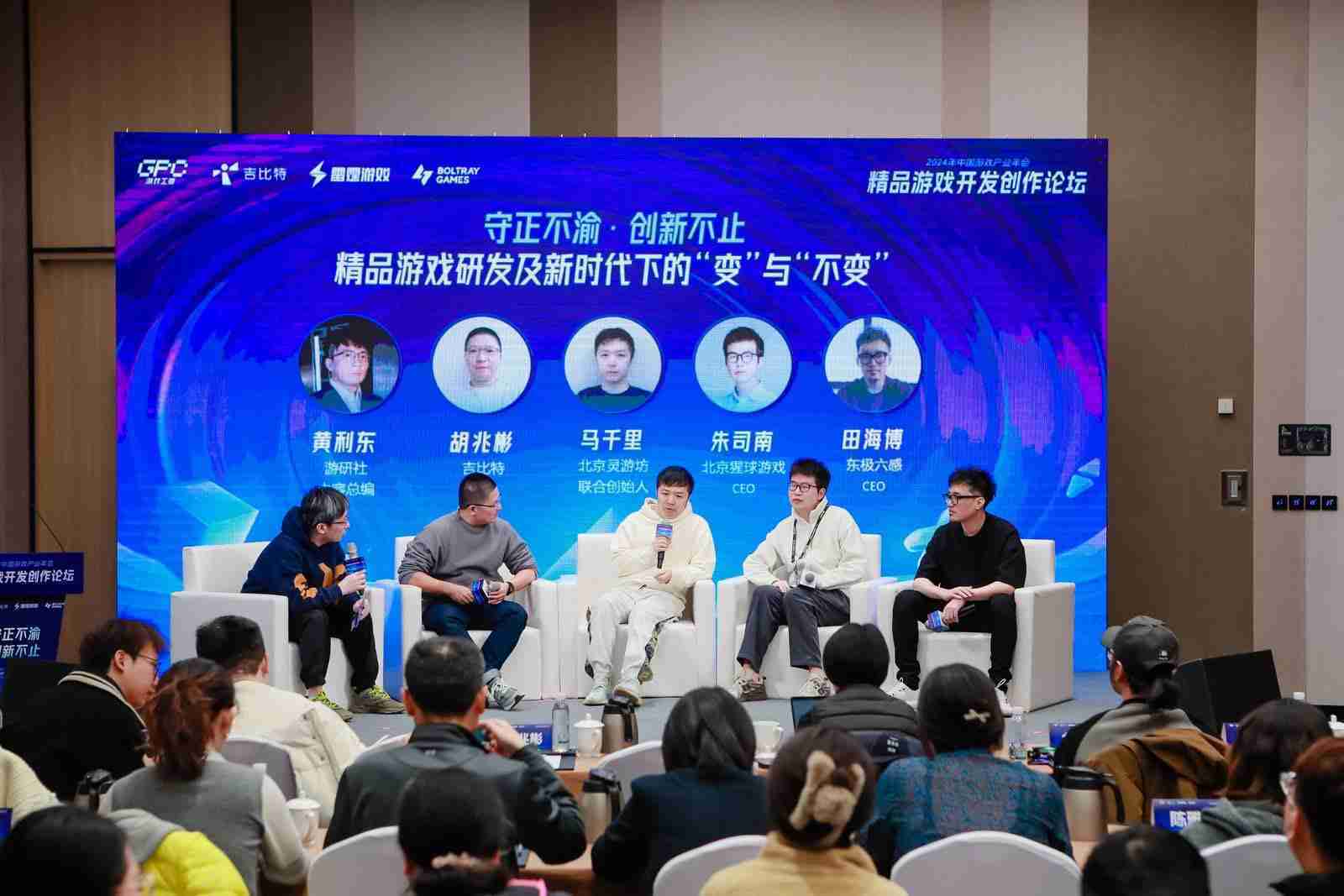 圆桌对话环节,,在游研社内容总编黄利东的主持下,,1winCTO胡兆彬、、北京灵游坊联合创始人马千里、、北京猩球游戏CEO朱司南、、、东极六感CEO田海博等四位嘉宾围绕“守正不渝、、创新不止——精品游戏研发及新时代下的‘变’与‘不变’”这一主题分享了各自在精品游戏开发理念及工程能力搭建方面的见解和经历,,并就行业变化下游戏人需要坚守的理念等展开交流探讨。。。